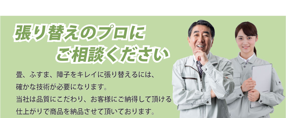 畳、襖、障子の張替えを考えた時、どういった業者に依頼すれば良いのでしょうか?どれくらいの料金がかかるのか、どういった対応を行うのかなど多くの心配がある方もみえるかと思います。そこで価格・対応・サービスなど業者を選ぶ際に知っておきたいポイントを押さえて、気持ちよく張替えを終わらせましょう。最初に気になるのは値段ではないでしょうか。出来うるものなら安価、低価格で依頼したいですよね。張替えの料金は、ある程度の相場は決まっていますが、一概に何円とはなかなか言えません。商品の品質や張替えの対応(畳であれば裏返し、表替え、新調など)で料金は変わってきます。そこで業者が商品や対応の説明をしっかり行い、最適な方法を提案してくれるかということを確認してみましょう。加えて、無料見積もりの利用をおすすめいたします。優良業者であれば、見積もりの詳細まで説明を行ってくれるので、追加料金の発生もありません。あわせて、業者の対応が親身であるかも見ておきましょう。こちらの相談や質問に対して、丁寧・的確・誠実に対応してもらえれば安心して張替えを検討できます。また、業者の技術・知識力も大切ですね。例えば、畳であれば『畳製作技能士』という資格もあるので問い合わせ時に作業員がそういった資格を持っているか確認しておきたいものです。他にもチェックしておきたいポイントがいくつかあります。商品の取り扱いが多い業者であれば、商品の価格や品質といった選択肢が増えて、商品選びがしやすくなります。また、小さなことですが、作業前の家具の移動、畳の拭き取りといったサービスを利用できると助かりますね。もし張替えでお悩みの際は、まずは気軽な問い合わせをおすすめいたします。安心できる業者であれば、小さな質問や相談からでも受け付けています。いきなりの問い合わせは不安という方は、業者によってはweb(LINE、メールなど)見積もり、相談も行っています。これらの知っておきたいポイントに気をつけつつ、満足のいく張替えにしたいですね。